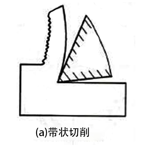 (1)帶狀切削:在切削過程中,如果滑移面上的滑移沒有達(dá)到,破裂強(qiáng)度時(shí)(即塑性變形不充分),就會(huì)形成連綿不斷的帶狀切削,(見圖 a) 在切削靠近過的一面很光滑,另一面呈毛茸狀。